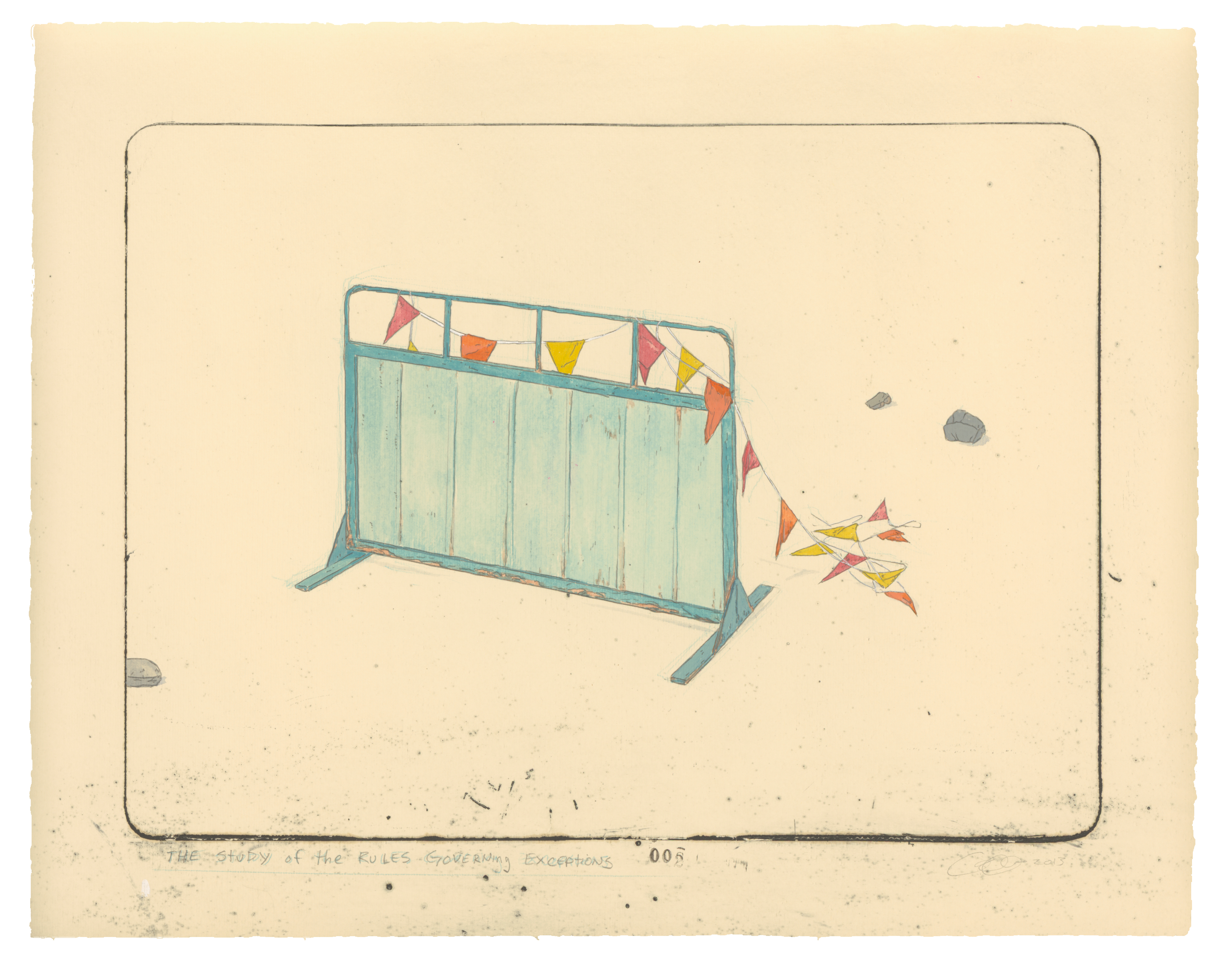 The Study of Rules for Governing Exceptions takes its title from Pataphysics—a nonsensical pseudo-science invented by Alfred Jarry, the early 20th century, French avant-garde writer. Jarry’s transgressive curation gave me permission to investigate the space between print and drawing. In these works, numbering just over a dozen prints so far, a simple line etching of a rectangle serves as a frame within a frame, in which decontextualized images of street furniture are drawn and painted in gouache. In an effort to further play with the conventions of the edition print, these works have differing rule numbers added with a rubber stamp, an office print tool used only rarely with fine art prints.